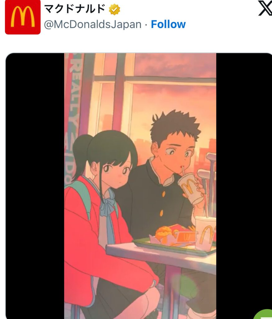 【悲報】日本マクドナルドさん、また普通の男女二人だけの不健全動画を出し海外から批判
