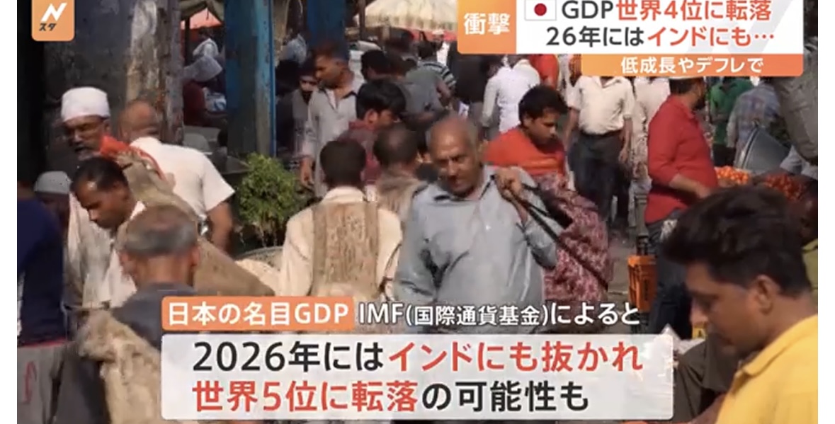 2026年にはインドにも抜かれ、日本は近い将来、GDPで世界5位に転落する可能性もあります。
