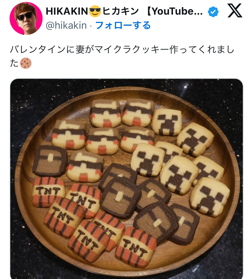 引用元: ・【YouTuber】「器用ですね」「すごい!」HIKAKIN、妻の手作り“マイクラクッキー”を披露→幸せなバレンタイン報告に「いいね」30万超え