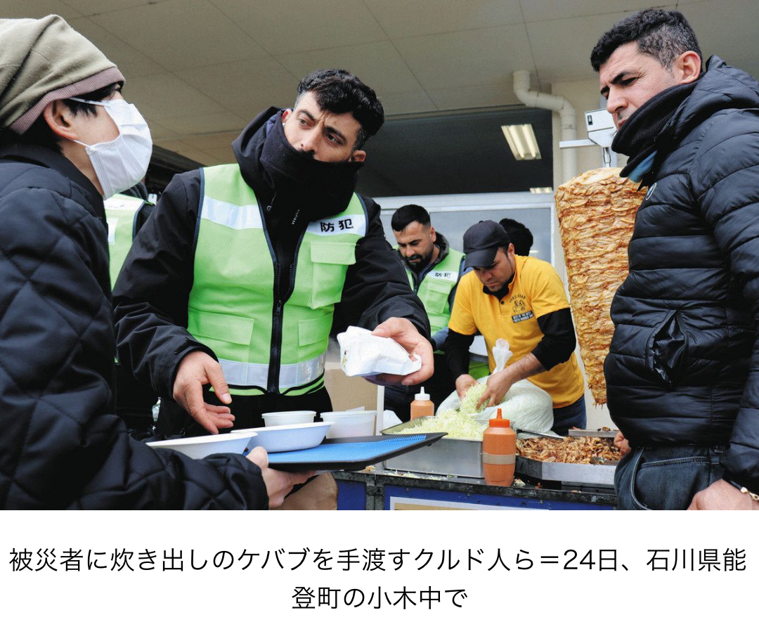 24日には能登町の小木中学校内の避難所で、埼玉県で暮らすトルコ出身のクルド人10人ほどがケバブやスープの炊き出しをした。企画した日本クルド文化協会代表のチカン・ワッカスさん(32)は「昨年のトルコ地震では日本からもたくさんの支援をいただいた。今こそ、恩返しがしたい」と話した。