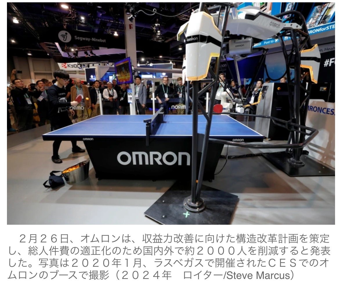 ロイター[東京 26日 ロイター] – オムロンは26日、収益力改善に向けた構造改革計画を策定し、総人件費の適正化のため国内外で約2000人を削減すると発表した。国内ではグループで1000人程度の希望退職者を募る。7月20日時点で勤続3年以上かつ40歳以上の正社員などを対象とする。
