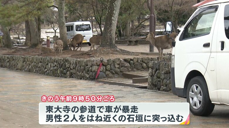 目撃者によると、参道に入ってきた車は、土産物店に向かってスピードを落とさず、男性をボンネットに乗せた状態で走行。そして、店の前の傘立てに当たると、5秒ほど停止。