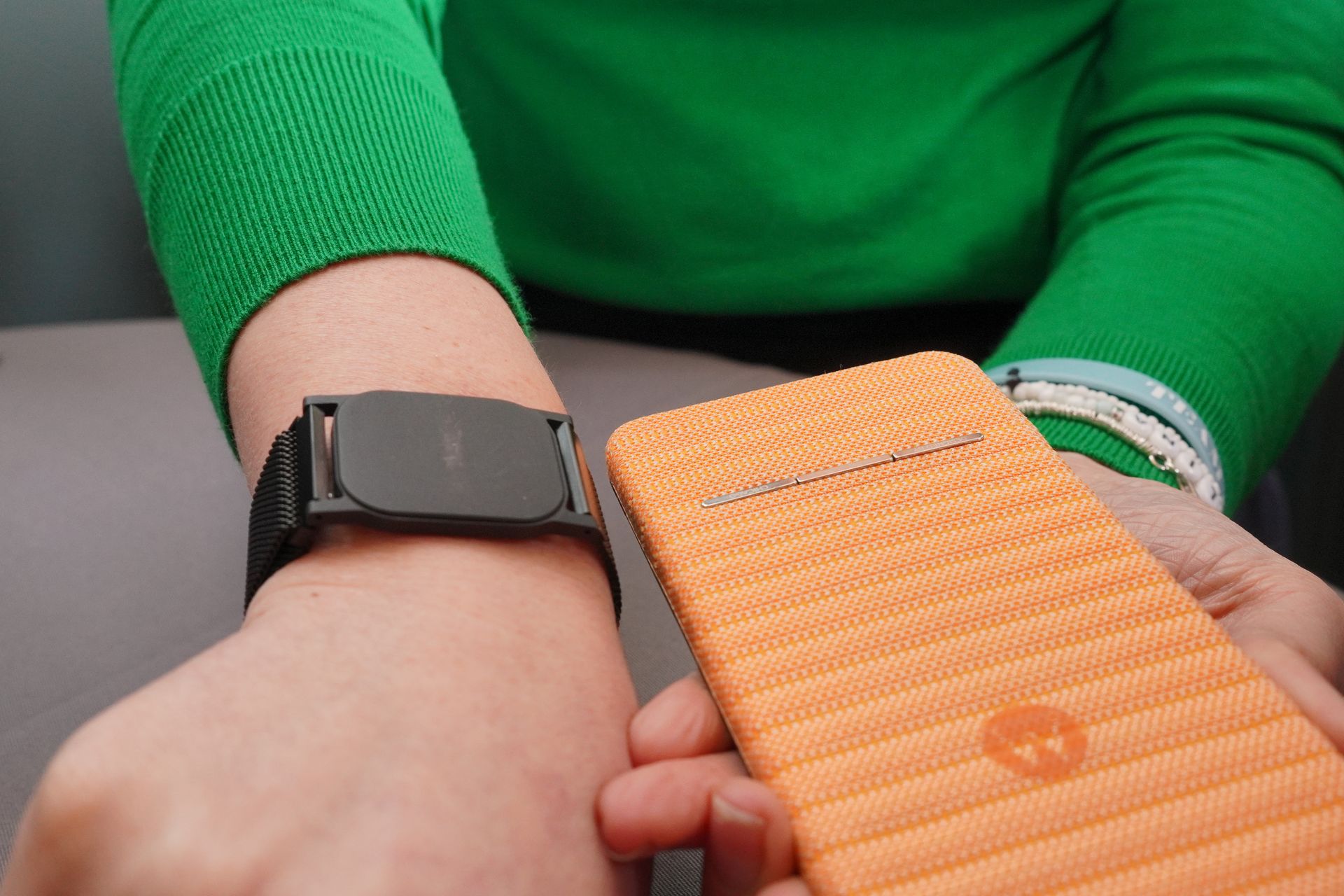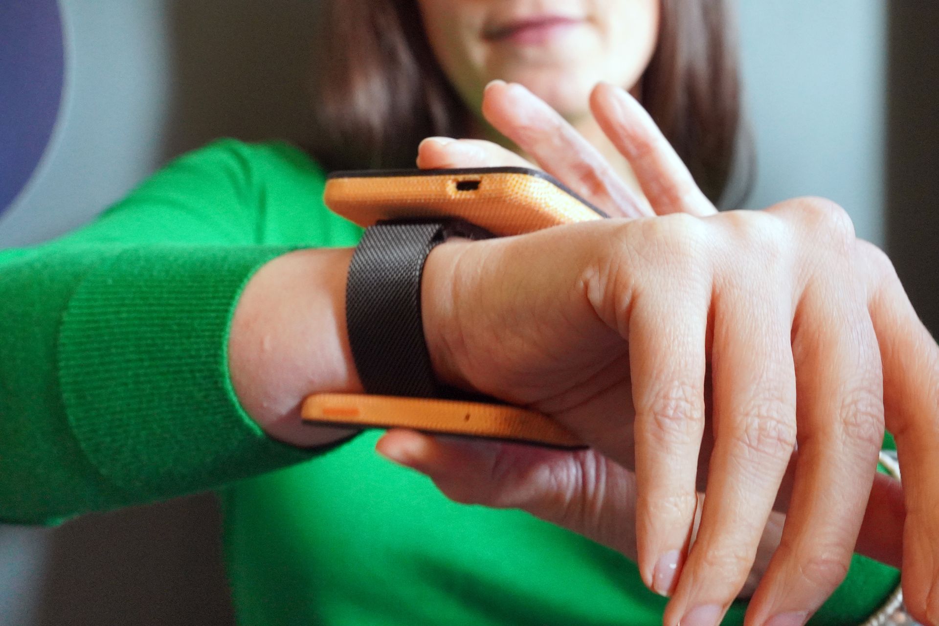背面には2つのマグネットを装備しており、これを金属のバンドに装着することで腕に巻き付けることができる。伸ばすと縦長の一般的なスマホだが、折り曲げてバングルのように巻き付けられるというわけだ。