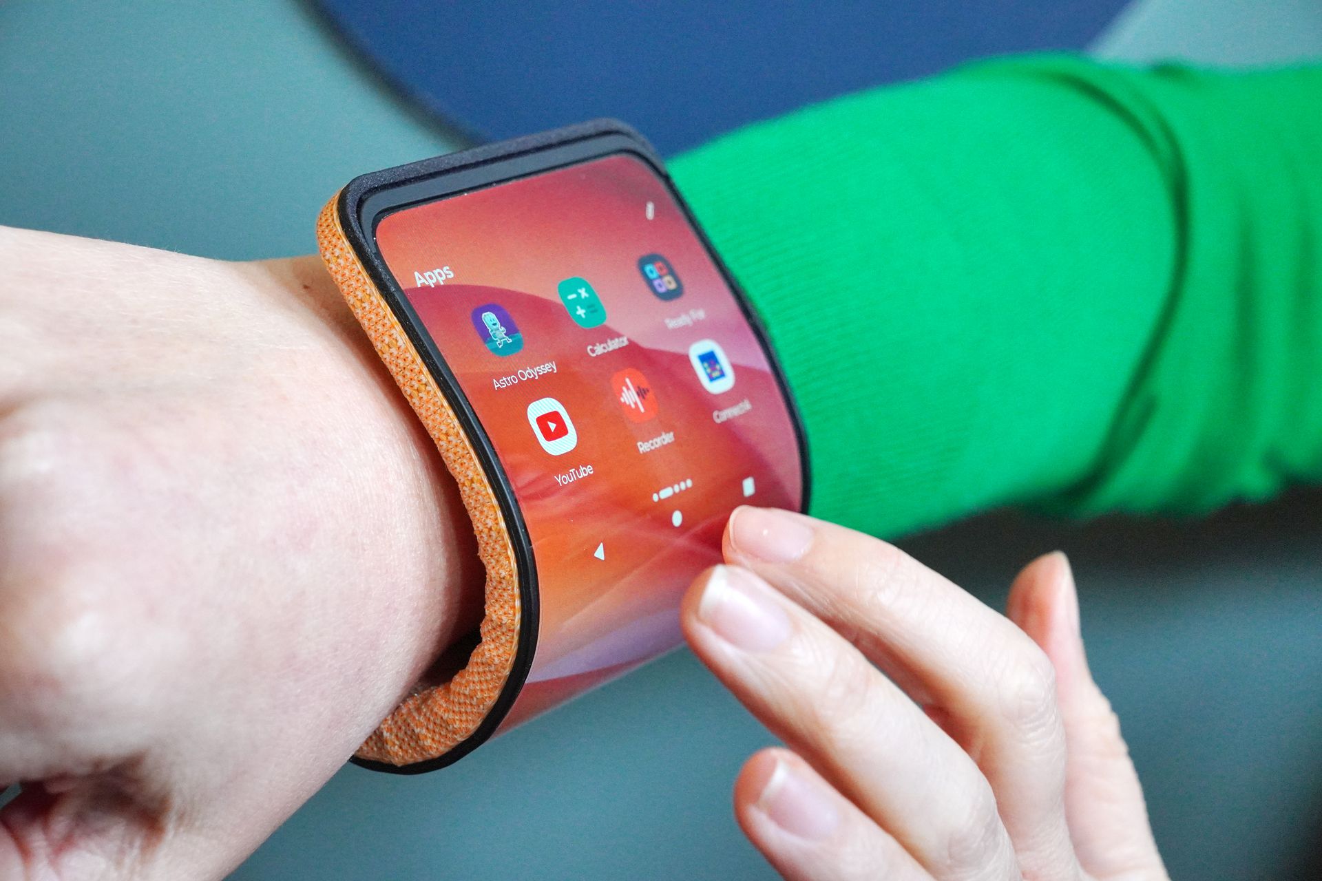 折り曲げた際にもディスプレイには時計やアプリなどが表示され、さながら大型のスマートウォッチのように情報を確認したり、操作したりすることができる。