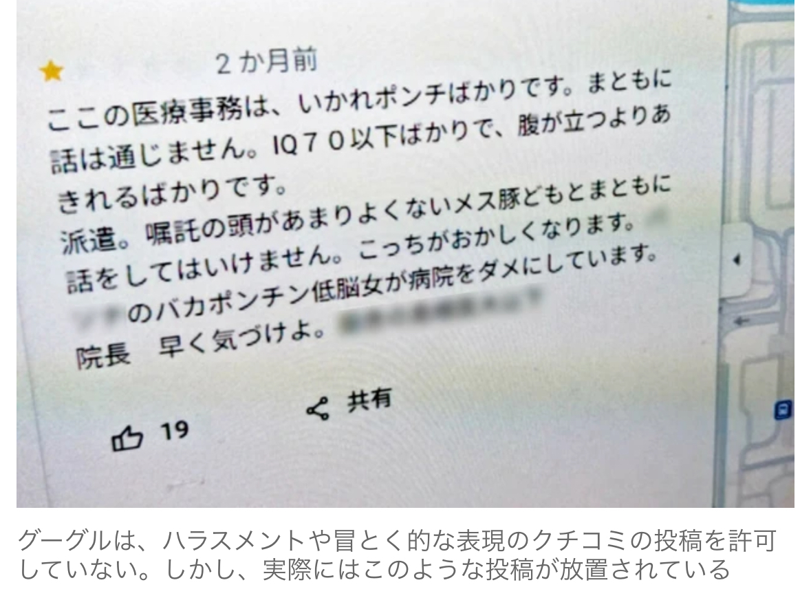 飲食店や病院などを選ぶ際に、参考になる「クチコミ」。しかし、実名を挙げての罵詈雑言や暴力的な書き込みが削除されずに放置されているとして、国内で最も多く利用されているグーグルマップを運営するグーグルに対して、医師や歯科医師ら90人が今春、損害賠償を求めて東京地裁に集団提訴する。否定的なクチコミに対し、病院側から「反論」「説明」するのは難しく、グーグルもなかなか削除に応じないため、低評価を恐れる病院側を患者が脅迫したり、弱みに付け込む「削除ビジネス」が横行したりしているという。(続きは以下URLから)