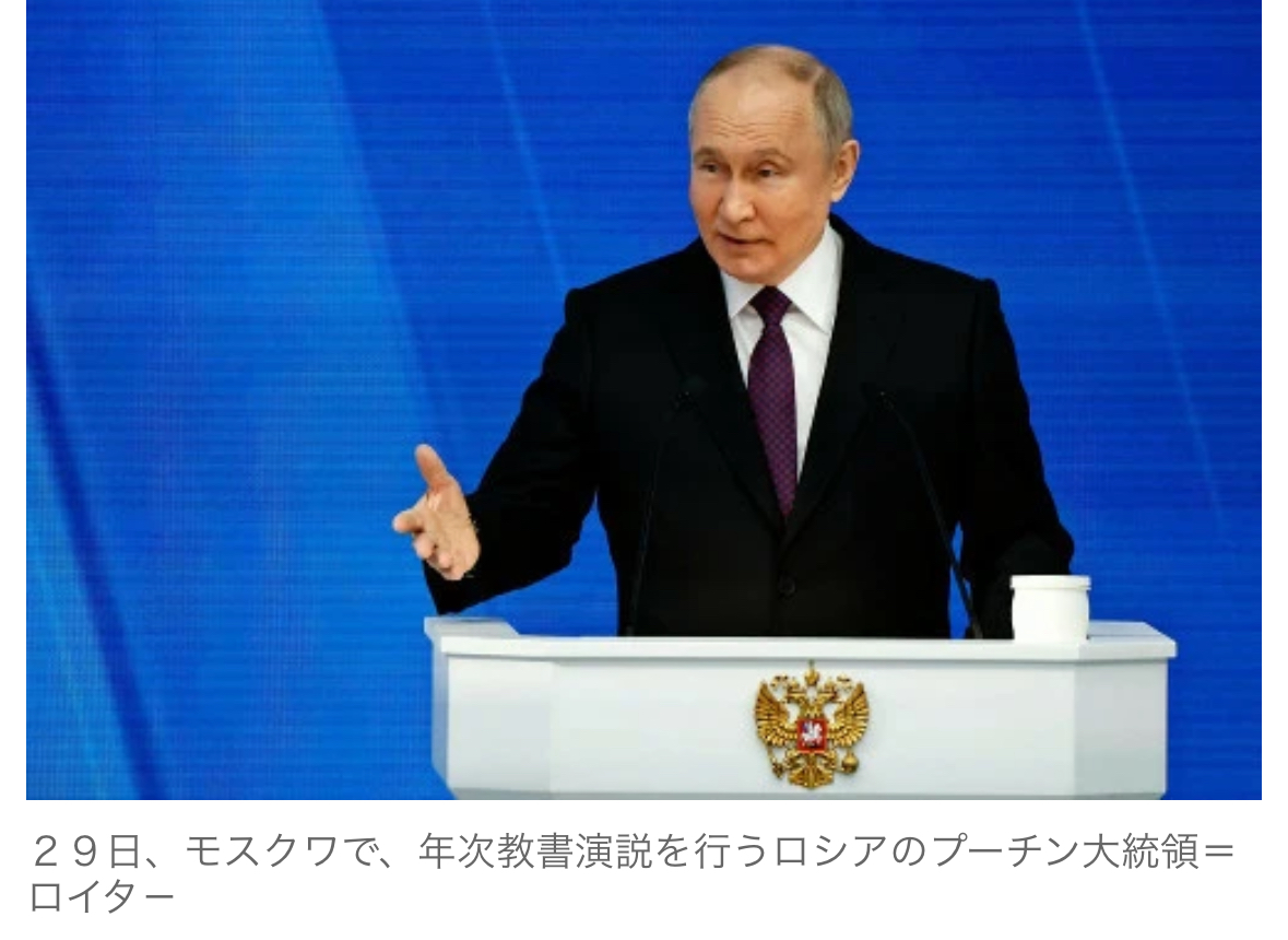 ロシアのプーチン大統領は2月29日、モスクワで各界の代表者を前に今後の内政・外交の施政方針を示す「年次教書演説」を行った。2月24日で2年を迎えたウクライナ侵略について、「圧倒的多数の国民の支持を得ている」と主張した。「(戦闘での)主導権を握り、新たな領土を解放した」とも語り「戦果」を誇示した。スウェーデンの北大西洋条約機構加盟が決定したことに関連し、北欧諸国に対峙(たいじ)する露西部の露軍について「強化しなければならない」と語った。ロシアが欧州への軍事作戦を準備しているとの主張は