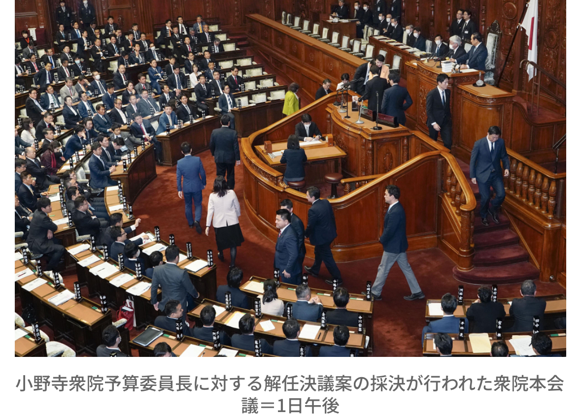 衆院で1日、2024年度予算案採決を巡る与野党攻防が激化した。与党は同日の予算委員会での採決を目指したが、野党の反対を受け、理事会で2日未明以降への先送りを決定。1日夕から集中審議を実施した。これに先立つ本会議では、立憲民主党が提出した小野寺五典予算委員長(自民党)に対する解任決議案が与党や日本維新の会などの反対多数で否決された。与党は23年度内の成立を確実にするため2日の衆院通過を目指す。立民は徹底抗戦の構えだ。