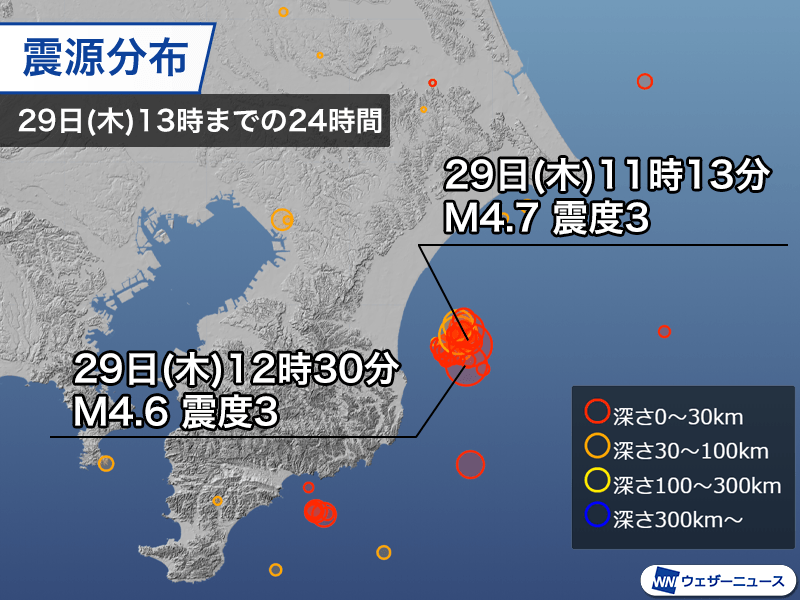 今日29日(木)は千葉県東方沖を震源とする地震が多発していて、昼前後には震度3を観測する地震が2回発生しました。沈み込むフィリピン海プレート上面で発生か