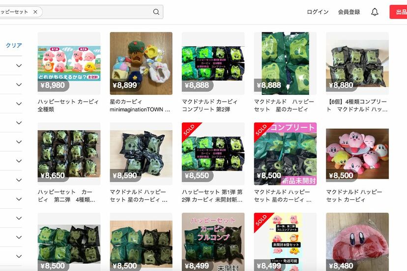 『メルカリ』をはじめとするフリマアプリには『カービィ』が大量出品され、ハンバーガーやドリンクを含めて約500円の商品が数千円、また数個セットで1万円以上と高額転売されているのだ。