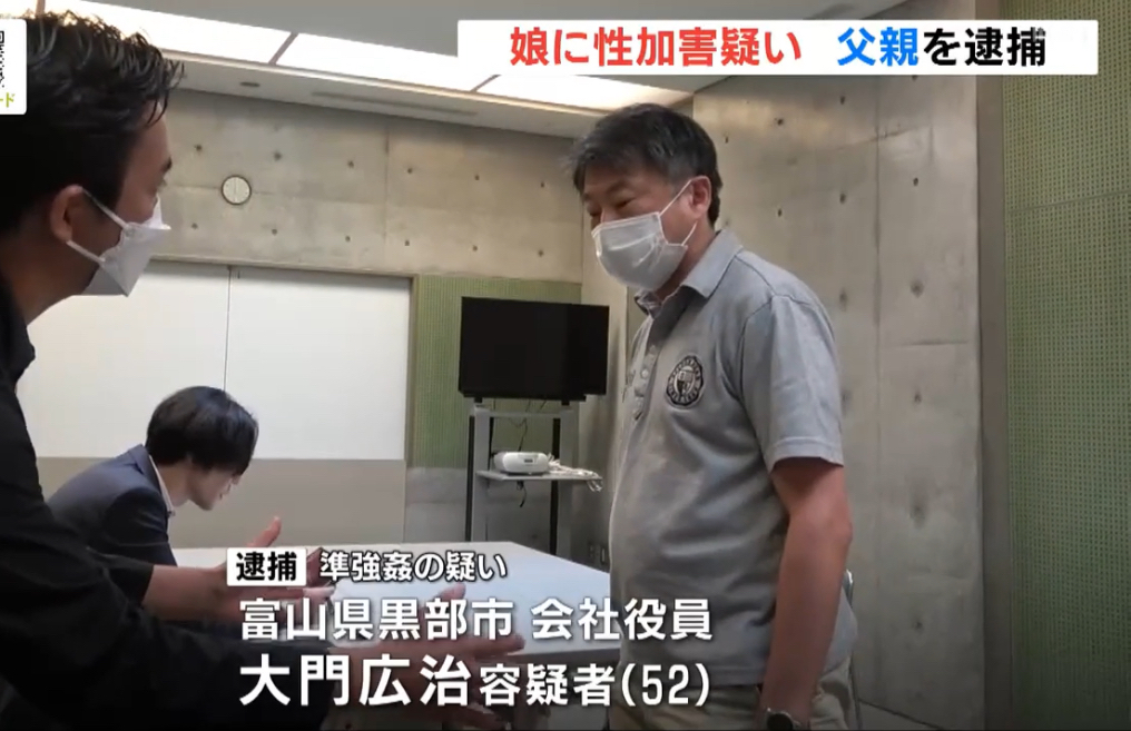 8年前に当時10代だった実の娘に対して性的暴◯を加えたとして、父親が3月6日に逮捕されました。 準強◯の疑いで逮捕されたのは富山県黒部市の会社役員・大門広治容疑者(52)です。警察などによりますと、大門容疑者は2016年、当時高校2年生だった実の娘・里帆さんに対して、抵抗できない状態だと知りながら性的暴◯を加えた疑いが持たれています。