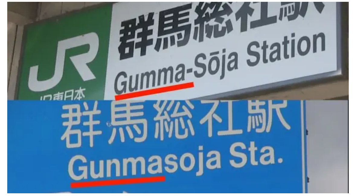 駅の看板には「ヘボン式」のローマ字が使われ真ん中の文字は「M」で表されていますが、駅を案内する道路標識は「訓令式」でこちらは「N」で表記されています。このように県内でも「グンマ」の表記が混在しています。