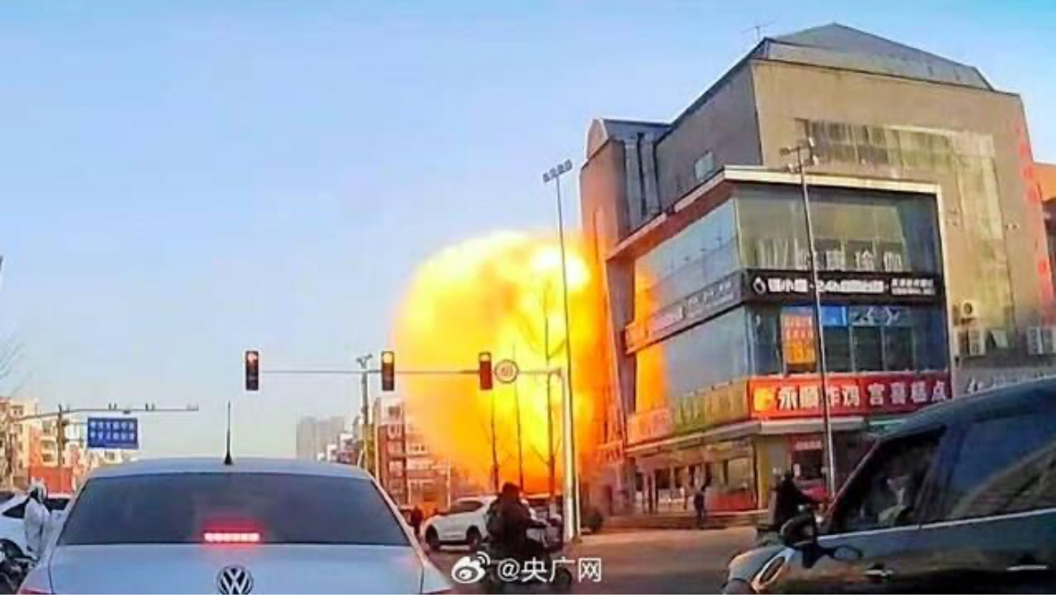2024年3月13日午前に河北省廊坊市三河で起きた爆発の瞬間とされる映像=中国国営メディアの微博アカウントから