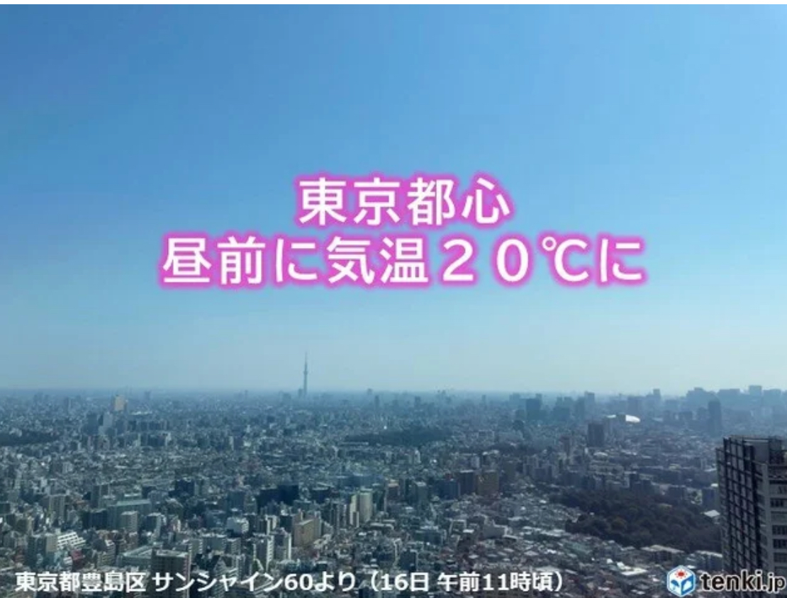 今日16日(土)は広く日差しが降り注ぎ、きのうより早いペースで気温が上昇中。東京都心など、すでに20℃に達した所も。4月並みの気温の所が多く、昼間は上着いらずの陽気です。花粉が非常に多く飛ぶ所があるため、室内に入る前に、服についた花粉を払うなど、帰宅時の対策も忘れずに。