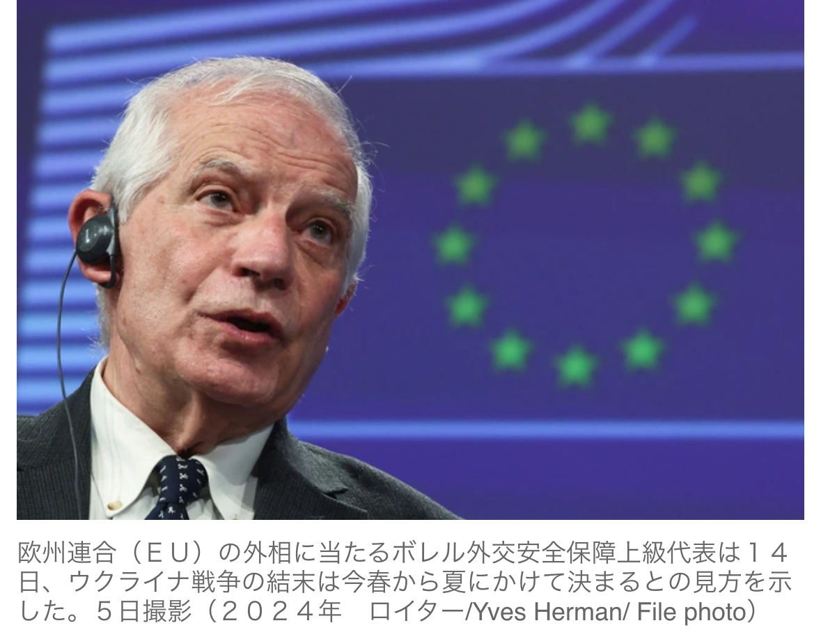 [ワシントン 14日 ロイター] – 欧州連合(EU)の外相に当たるボレル外交安全保障上級代表は14日、ウクライナ戦争の結末は今春から夏にかけて決まるとの見方を示し、新たな支援を早急に確保する必要があると訴えた。ワシントンでの会合後、記者団に述べた。