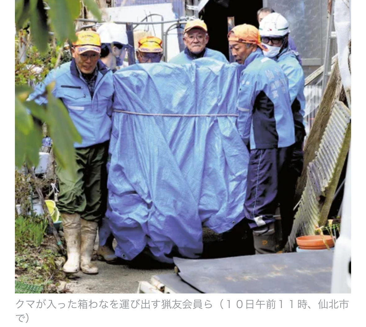小屋に逃げたクマは10日午前6時10分頃、地元猟友会員と仙北署員が、出口に仕掛けた箱わなに入ったのを確認し、扉を閉めた。その後、麻酔で眠らせ、箱わなごと軽トラックで運び出した。けが人はいなかった。