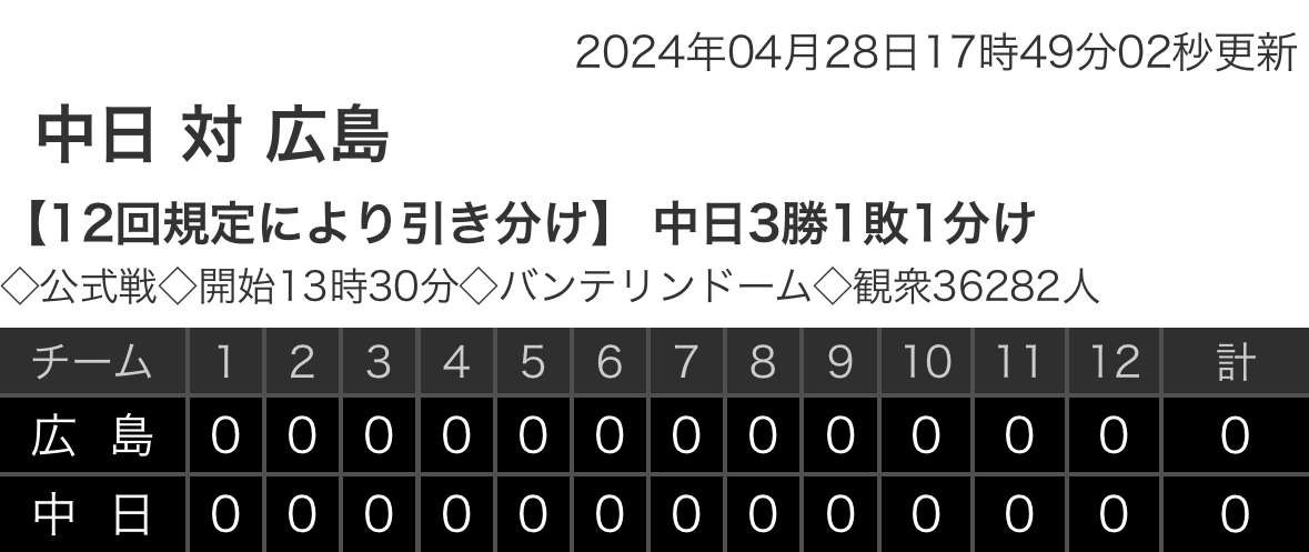 引用元: ・【タコ焼き】セ・リーグ D 0-0 C [4/28] 中日-広島は延長12回引き分け 中日13残塁 [鉄チーズ烏★]