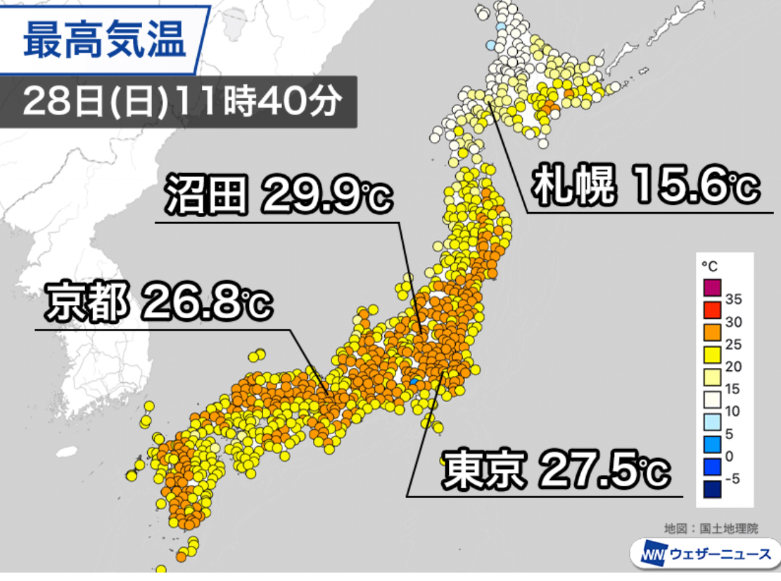 11時40分までの最高気温は群馬県沼田市で29.9℃、福島県伊達市・梁川で29.8℃など内陸部では30℃に迫っている所があります。そのほか、東京都心で27.5℃、京都市では26.8℃とすでに夏日です。