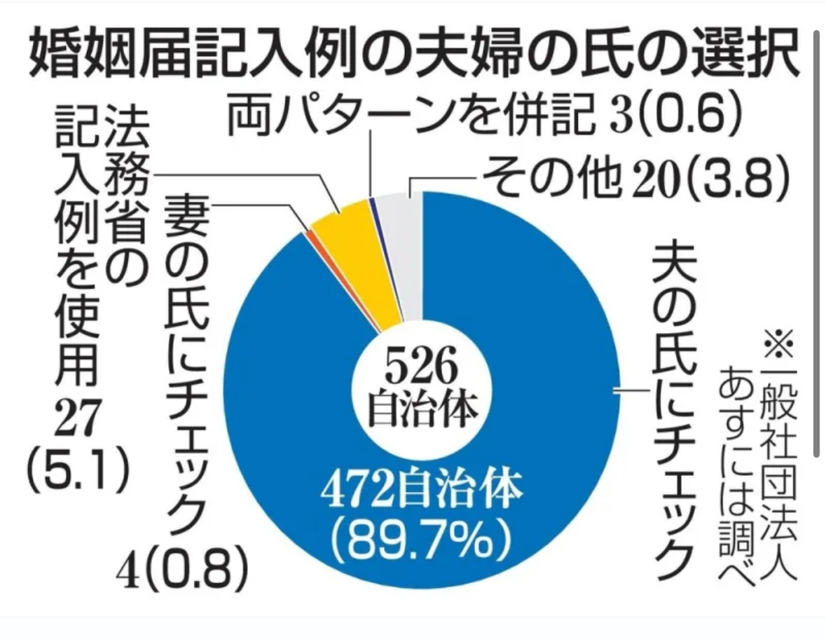 婚姻届にはどちらの姓を選択したかチェックを入れる欄があるが、法務省によると、記入例は各自治体の判断に任せているという。一般社団法人「あすには」は23年9月以降、役所を訪れたり、自治体のホームページを確認したりして調査。24年2月の段階で、調査は全国1747自治体の約3割にあたる526自治体(47都道府県)に達し、(略)