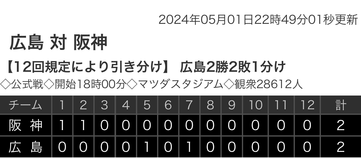 引用元: ・【野球】セ・リーグ C 2-2 T [5/1] 広島-阪神は延長12回引き分け 阪神セ・リーグの貯金独り占め [鉄チーズ烏★]
