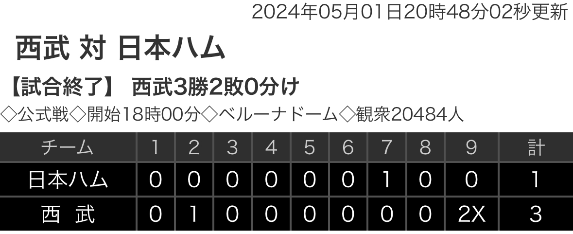 西武. 0 1 0 0 0 0 0 0 2x|3 【バッテリー】