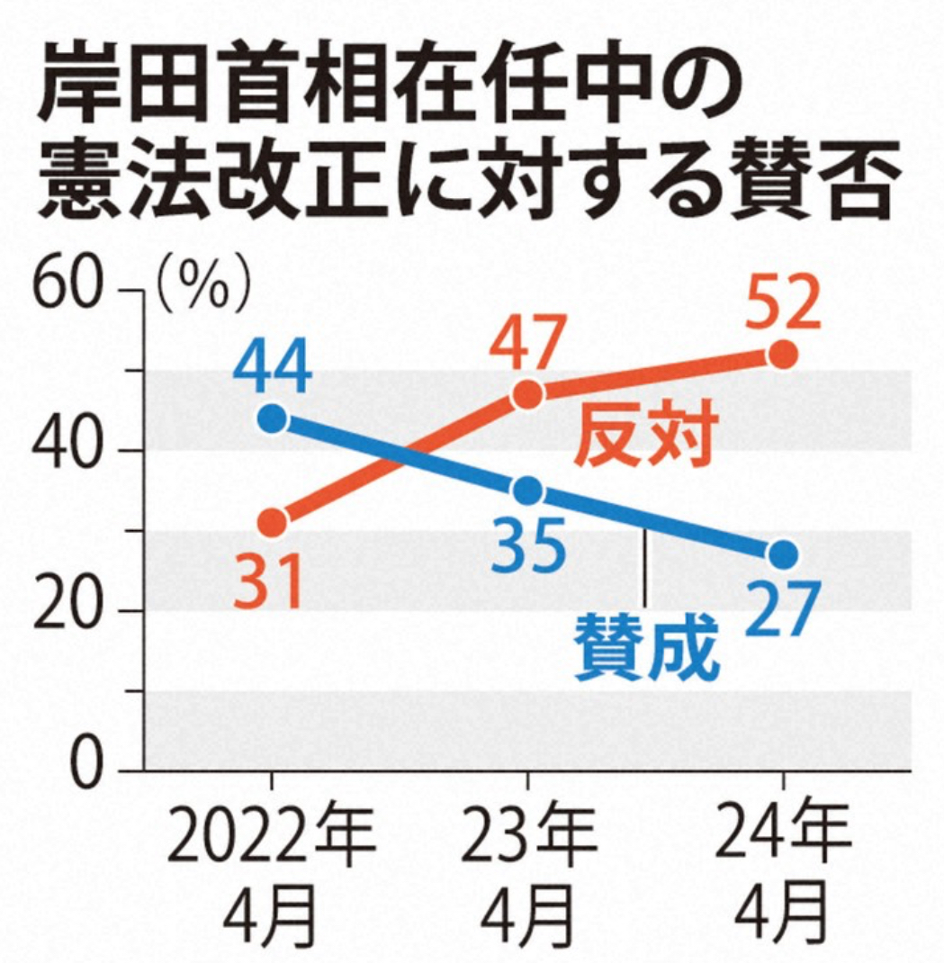 2022年4月の調査は「賛成」が44%、「反対」は31%と賛成が上回っていたが、23年4月の調査では「賛成」が35%、「反対」は47%と賛否が逆転している。2年連続で「賛成」が減少する一方、「反対」が増加した。首相は自身の自民党総裁任期中に憲法改正を目指すと発言しているが、9月末に1期目の任期満了が迫る中、世論の機運は高まっていない。