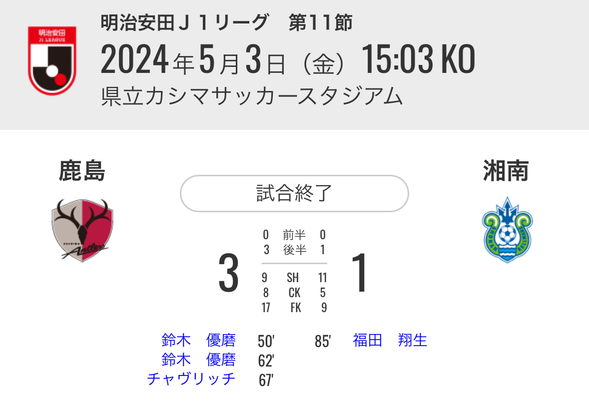 引用元: ・【サッカー】J1第11節昼2 鹿島×湘南、FC東京×京都、町田×柏、C大阪×札幌、鳥栖×東京V [久太郎★]