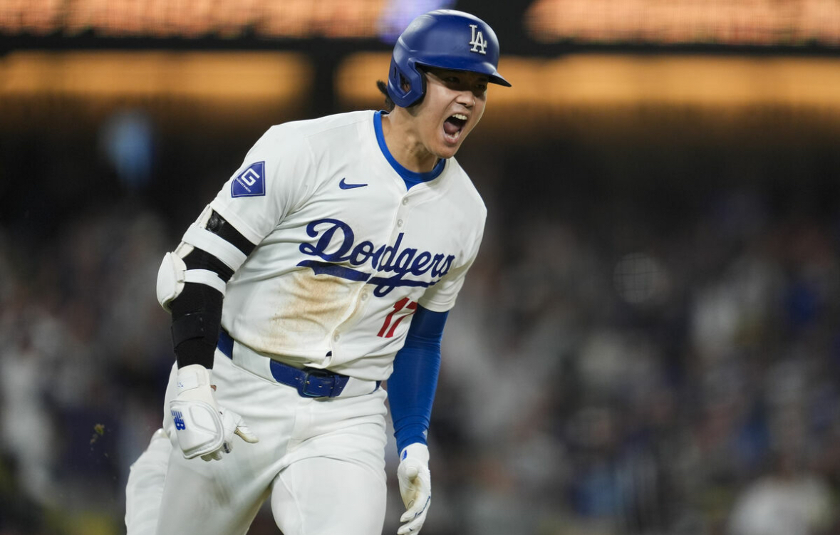 雄たけびをあげるドジャース・大谷翔平投手(AP)