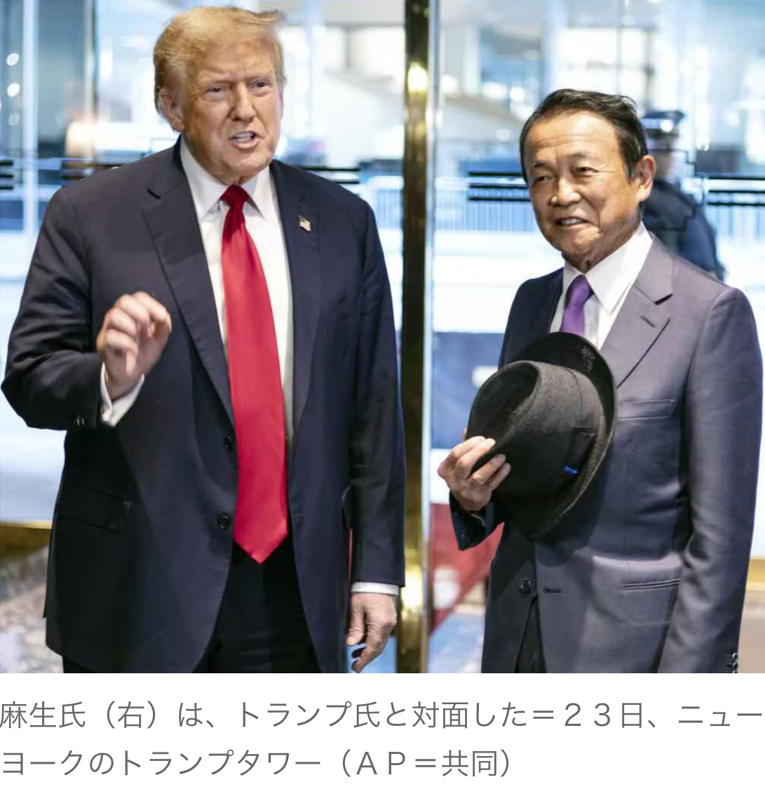 どちらに転んでも大丈夫なように、自民党の麻生太郎副総裁が先週23日、ニューヨークの「トランプタワー」を訪問し、トランプ氏と約1時間にわたって会談しました。岸田文雄政権の安保政策、特に防衛費増額などを説明し、トランプ氏も評価したと報じられています。