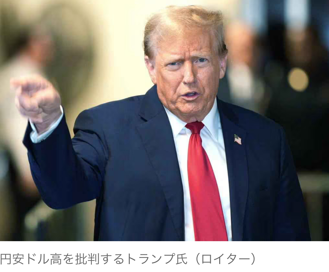 トランプ前米大統領は、為替の円安ドル高について「米国の製造業にとって大惨事だ」とSNSに投稿し、無策のジョー・バイデン政権を批判した。