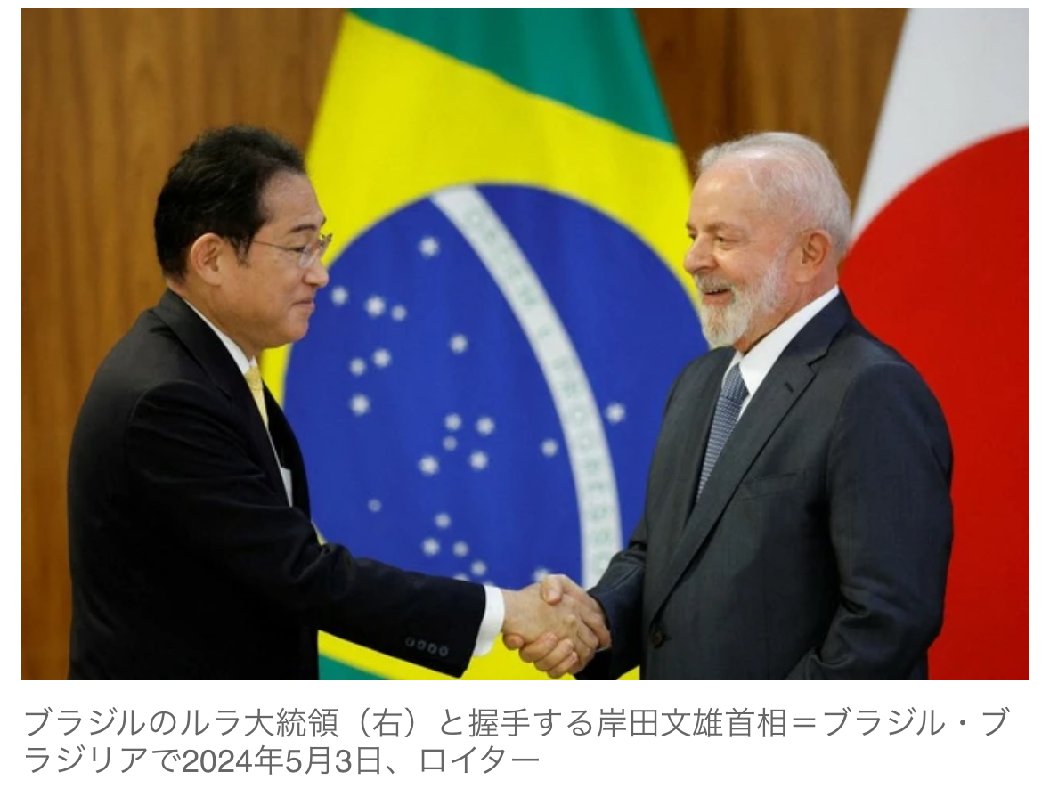 ブラジルのルラ大統領(右)と握手する岸田文雄首相=ブラジル・ブラジリアで2024年5月3日、ロイター