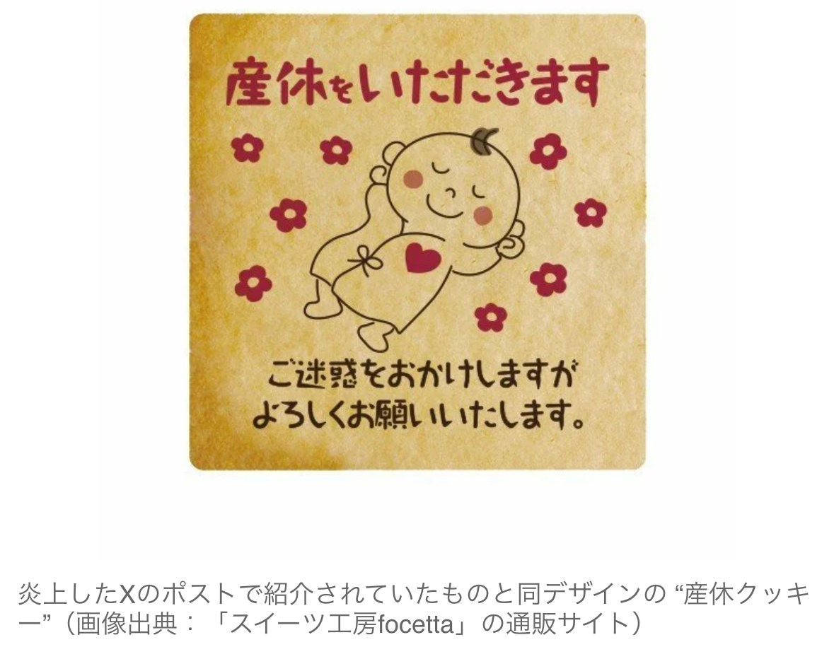 先月、「#産休クッキー」なるワードがXを騒がせた。妊婦の女性が、「産休をいただきます ご迷惑をおかけしますがよろしくお願いいたします」というメッセージと、かわいらしいイラストがプリントされたクッキーを職場で配った旨をポストしたところ、「不妊治療中の人への気遣いに欠ける」「産休で迷惑をかけるのにお花畑すぎる」といったバッシングが相次いだのだ。炎上した“産休クッキー”を手がけるメーカーの会長は、「世間の不満のはけ口に使われた」と話すが、その真意とは。