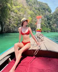 写真には、赤色の水着を着てサングラスをかけたマギーさんがボートに乗っている様子やアイスを食べている姿が写っています。