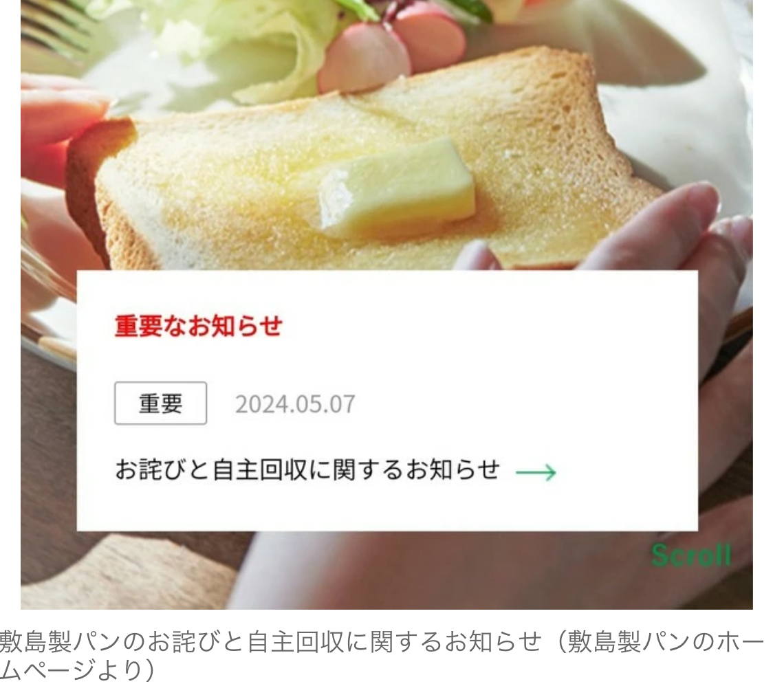 現在、異物混入により、健康被害の報告は出ていないが、敷島製パンは「お客さまならびにお取引先様、関係者の皆様には多大なご迷惑とお手数をおかけいたしますことを深くお詫び申し上げます」と謝罪し、「原因究明と対策強化のため、当面の間、当該ラインを休止します」と対応を発表した。
