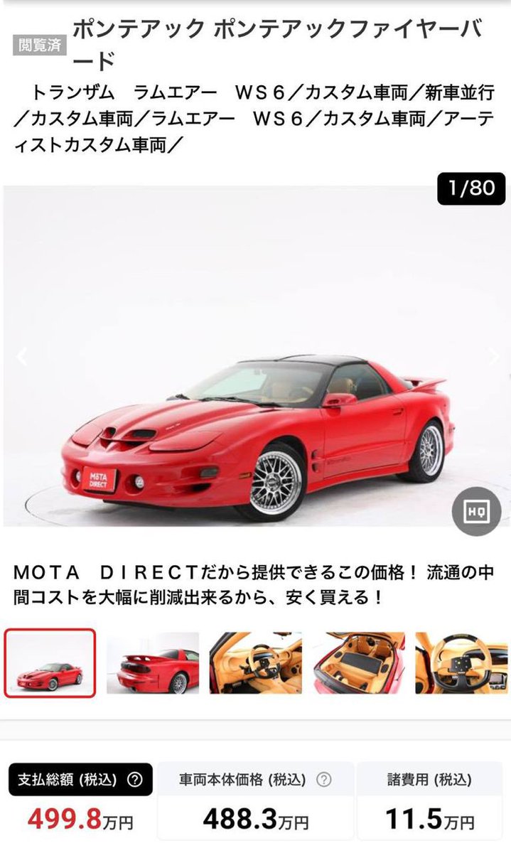 車はポンテアックのファイヤーバードで最上級グレードのトランザム。1967年にデビューしたスペシャルティーカーで、アメ車好きを中心に今でも熱心なファンが多い。この画像では販売価格は499.8万円となっていた。