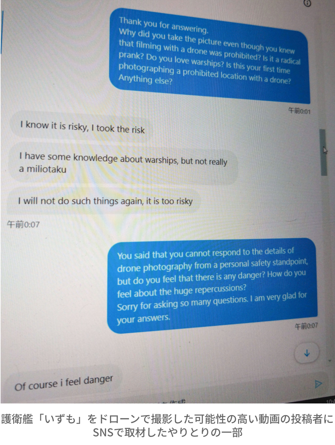 海上自衛隊のヘリコプター搭載型護衛艦「いずも」をドローンで撮影した可能性の高い動画がSNSに投稿された問題で、動画を投稿した人物が10日までにSNSを通して取材に応じ、撮影に際して「妨害を受けなかった」と主張した。自衛隊はドローンを探知し無許可飛行と判断すれば電波妨害や捕獲を試みる。投稿者の主張が正しければ自衛隊の対策に不備があったことになる。