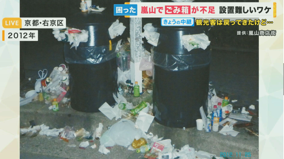 人気観光地・嵐山 “ごみ箱”がない問題 あふれるごみの問題から市がごみ箱を撤去 観光客や地元は困っているが再設置は難しいこちらのメインストリートには、今ごみ箱が1つもないんです。観光客の方に聞きましたら、ごみ箱がないので、お団子のベタベタのごみをティッシュにくるんで、駅の方まで持って行って捨てようか、なんて言ってまして、かなり困った様子でした。