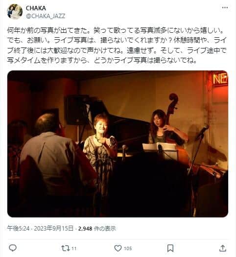 CHAKAさんは、ジャズライブに訪れた客から「もうPSY・Sの歌は歌わないんですか?」と聞かれることもあるという。「ライブ来てくれるのは嬉しいけど 悲しい なので、言わないでくれますか?」と呼びかけると、「今の私には加齢で歌えないし CDで聴くのが一番だと思う 相方はライブやりたくなかった人 きっとCD聴くのが一番喜ぶんじゃないかな?」とも述べた。