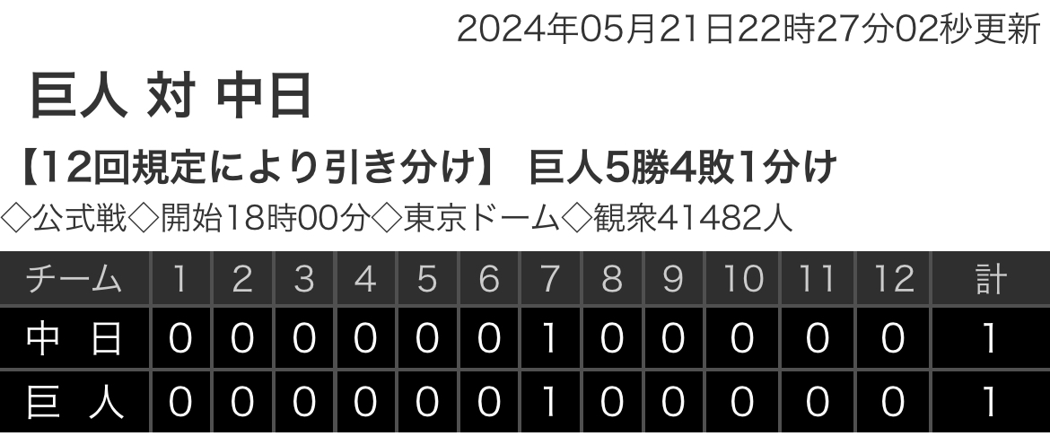 引用元: ・【野球】セ・リーグ G 1-1 D [5/21] 巨人-中日は延長12回引き分け 両軍合わせて23残塁 中日・田中プロ初HR [鉄チーズ烏★]