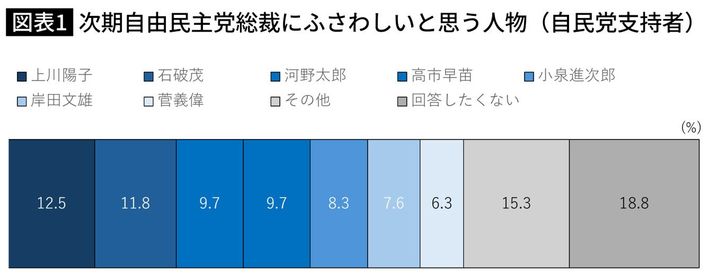 しかし、実際の自民党支持者に限定すると、1位・上川氏、2位・石破氏、3位・4位同着・河野太郎氏・高市早苗、6位・小泉進次郎、7位・岸田文雄……という結果になった。