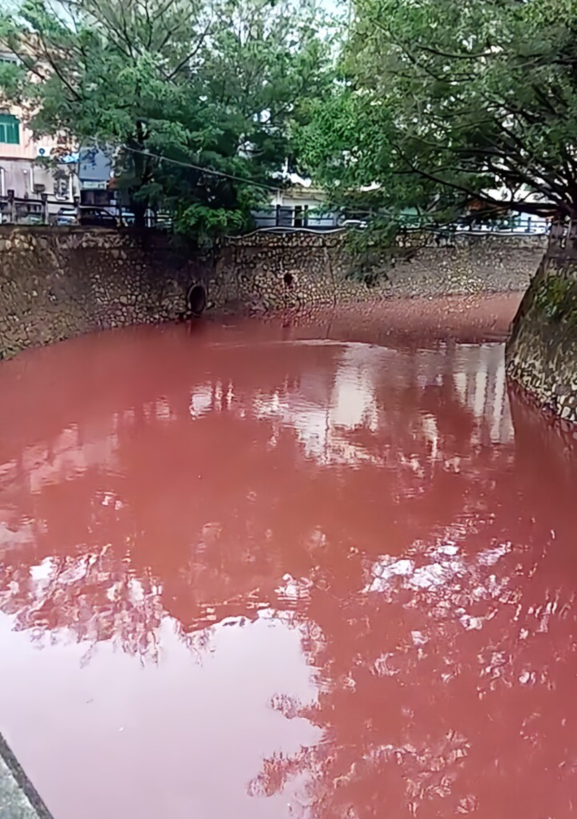 中国メディアの極目新聞によると、中国南部の広東省恵州市仲愷高新区陳江鎮で20日、川の水が赤く染まり、魚が死んだ。