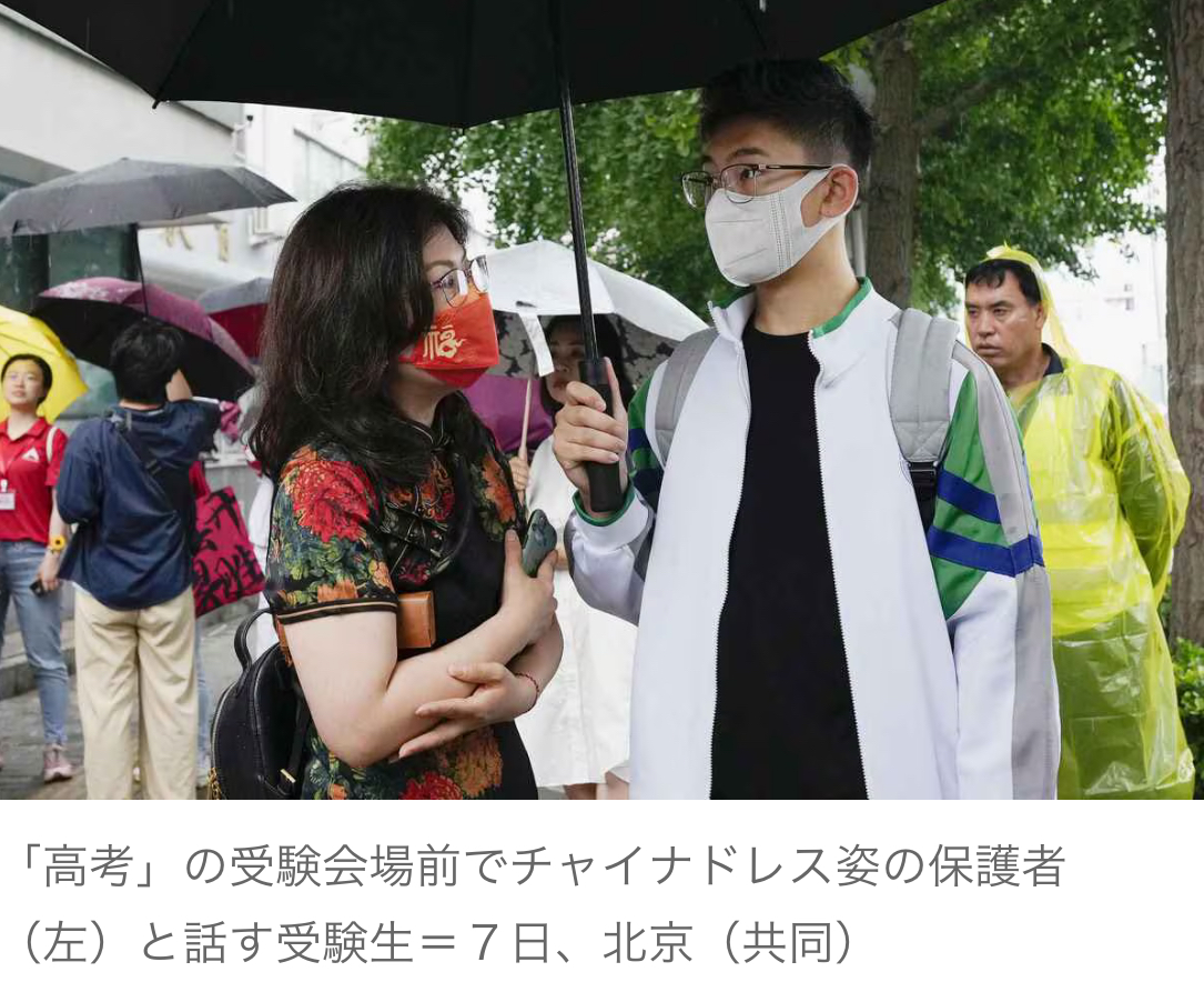 北京の受験会場の一つとなった中国人民大学付属中学では、必勝祈願の験かつぎとしてチャイナドレスなどで正装した保護者に見送られる多くの受験生の姿が見られた。