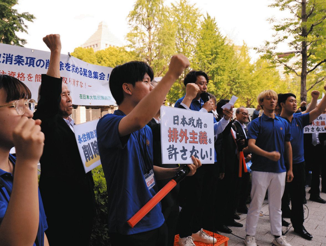 国会審議中の入管難民法改正案に税の滞納などを理由に外国人の永住資格を取り消せる規定が盛り込まれていることについて、日本に住む在日韓国人の団体「在日本大韓民国民団」(民団)など韓国系団体は6日、東京・永田町の参院議員会館前で緊急集会を開いて規定の削除を求めた。