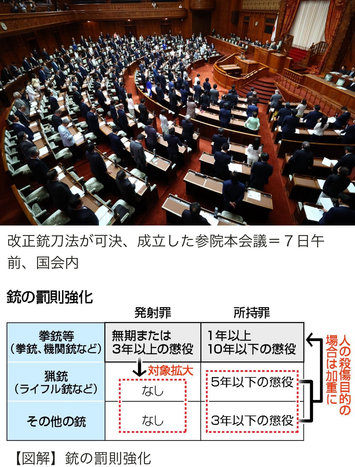 インターネット上に拳銃の製造方法を投稿し、不法所持を呼び掛けるなどのあおり行為を罰則付きで禁止する改正銃刀法が7日の参院本会議で可決、成立した。7月中に施行される。安倍晋三元首相銃撃事件で、殺人罪などで起訴された被告はネット動画を見て銃を製造したとされ、自作銃の規制を強化する。 改正法は、ネット上などで銃の不法所持をあおったり唆したりすることを禁じ、1年以下の懲役または30万円以下の罰金を科すと定める。警察庁によると、動画や図面を投稿して不法所持を促したり、価格や連絡先を明記して拳銃の販売を持ち掛けたりするケースなどが想定される。