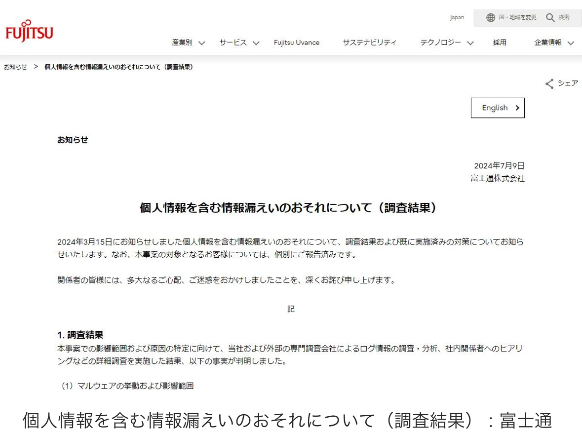 個人情報を含む情報漏洩のおそれについて : 富士通