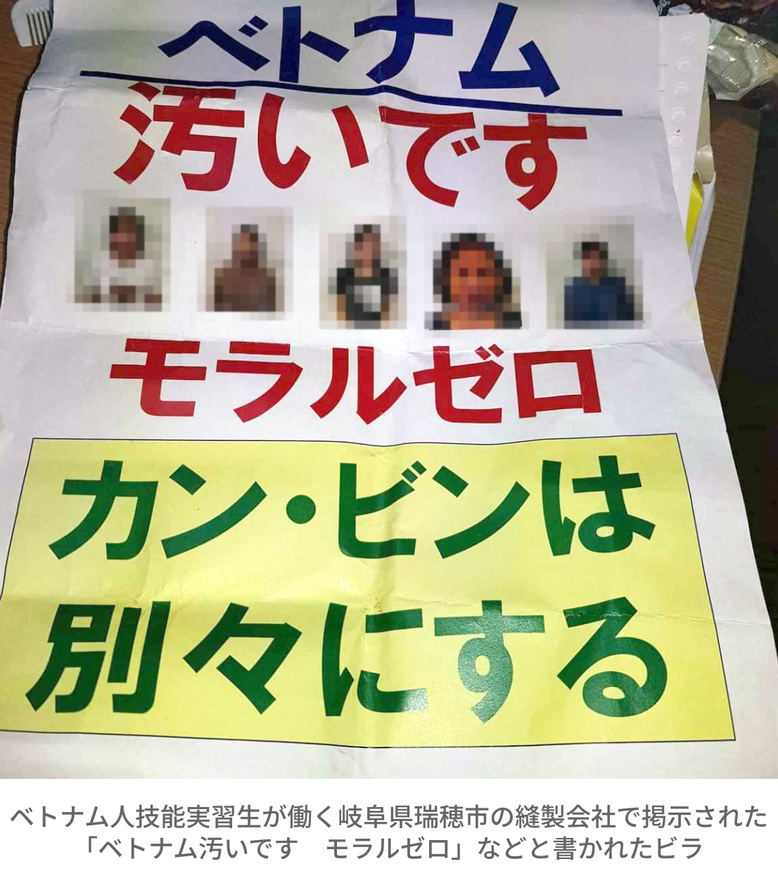 実習生だった複数の女性によると、ビラが掲示板などに貼り出されたのは今年5月12日。日本語で「ベトナム汚いです」という文字の下に、実習生として働いていたベトナム人女性5人の顔写真が並び「モラルゼロ」「カン・ビンは別々にする」と書かれていた。