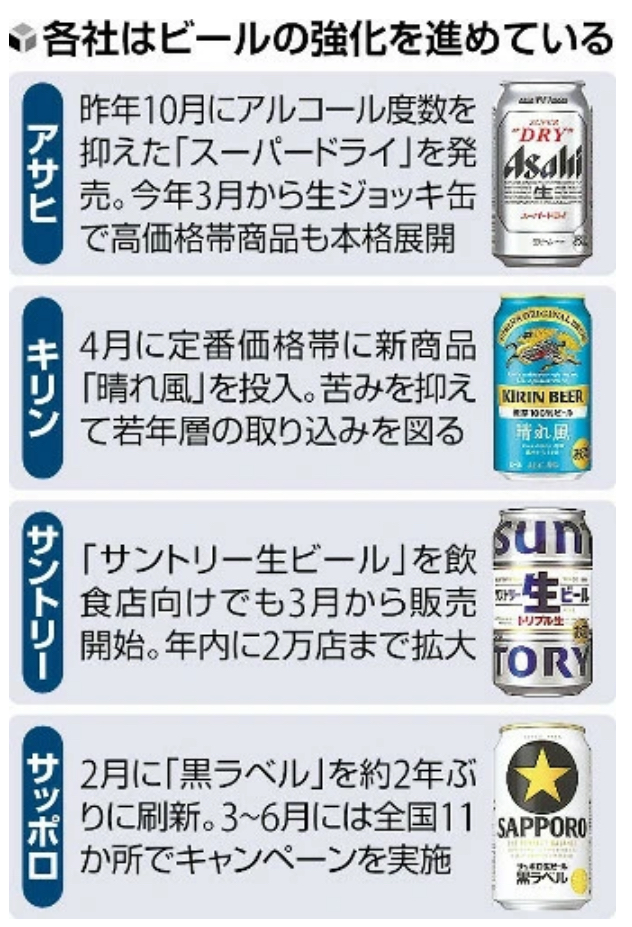 サッポロの「黒ラベル」が14%増、アサヒの「スーパードライ」が4%増となるなど、各社とも看板商品が好調だった。