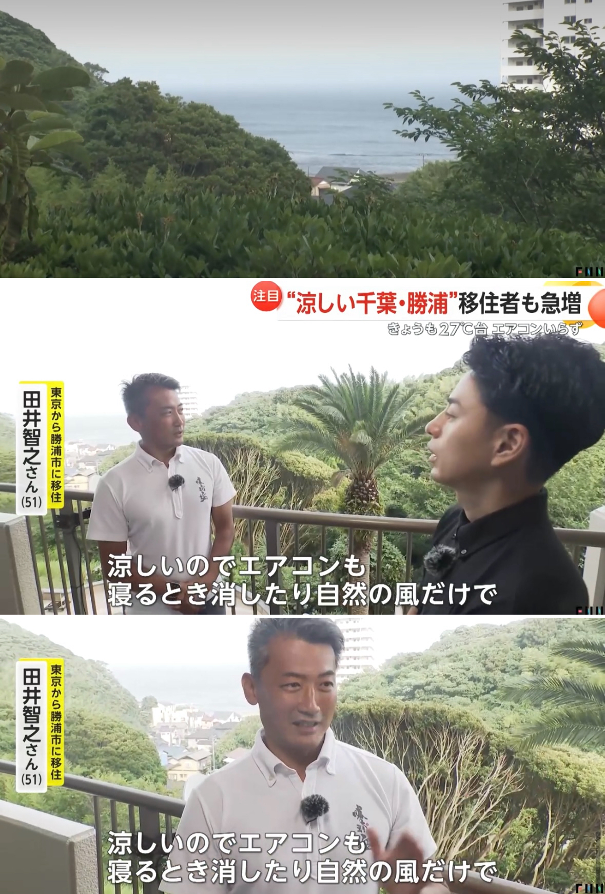 田井さんは「涼しいので、エアコンも寝るとき消したり自然の風だけで」とした上で、涼しい街・勝浦での生活を100点満点で言うと「120点です」と表現しました。