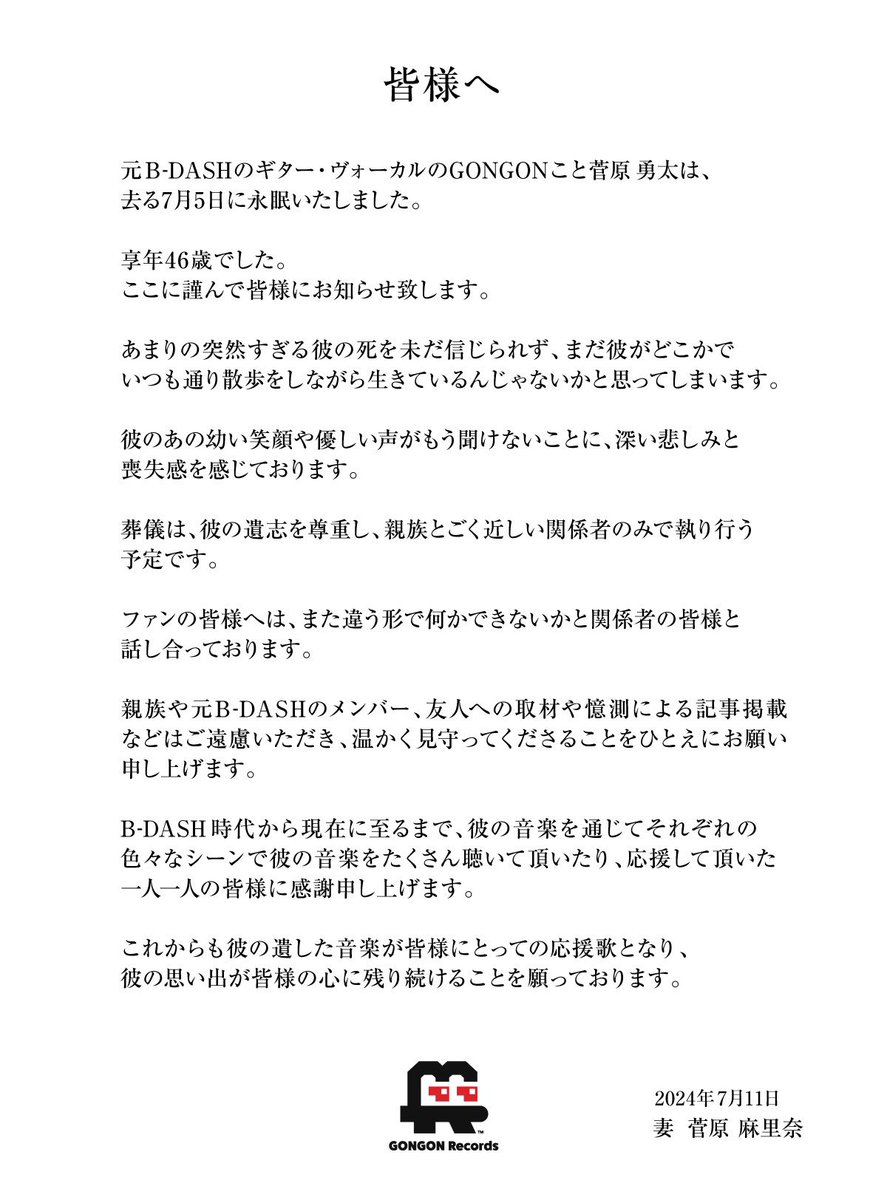 菅原さんの妻・麻里奈さんが「元B-DASHのギター・ヴォーカルのGONGONこと菅原勇太は、去る7月5日に永眠いたしました。享年46歳でした。ここに謹んで皆様にお知らせ致します」と報告。「あまりの突然すぎる彼の死を未だ信じられず、まだ彼がどこかで、いつも通り散歩をしながら生きているんじゃないかと思ってしまいます。彼のあの幼い笑顔や優しい声がもう聞けないことに、深い悲しみと喪失感を感じております」と心境をつづった。