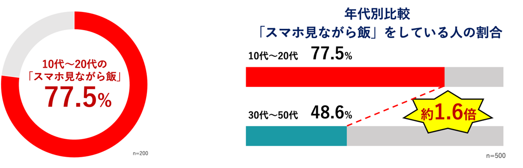 10~20代の「スマホ見ながら飯」の割合は、30~50代の約1.6倍(「味の素株式会社」調べ)