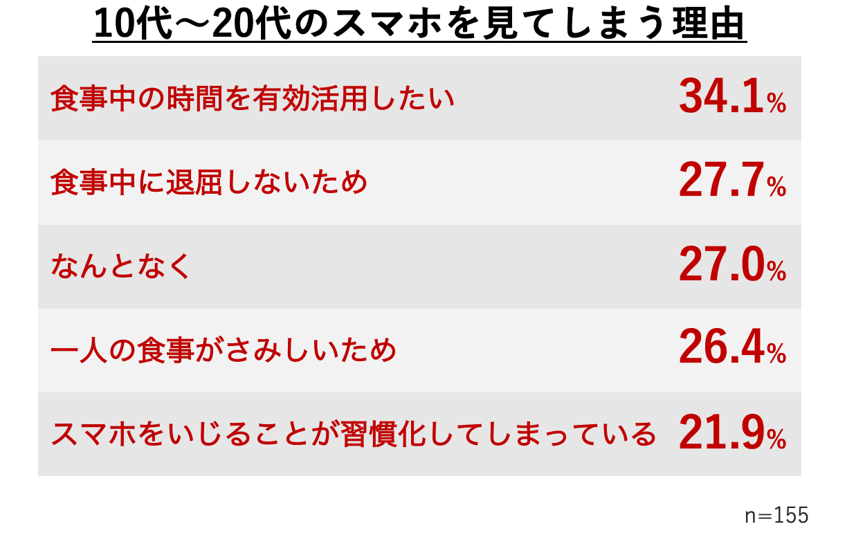 効率を求めてスマホを見るという声がある一方、「食事中に退屈しないため」27.7%、「一人の食事がさみしいため」26.4%と、暇つぶしの道具として、また孤食による寂しさを紛らわそうとしてスマホを見るという声も。また「なんとなく」27.0%、「スマホをいじることが習慣化してしまっている」21.9%という結果から、一定数の若者が食事中もスマホを手放せなくなっていることが判明した。